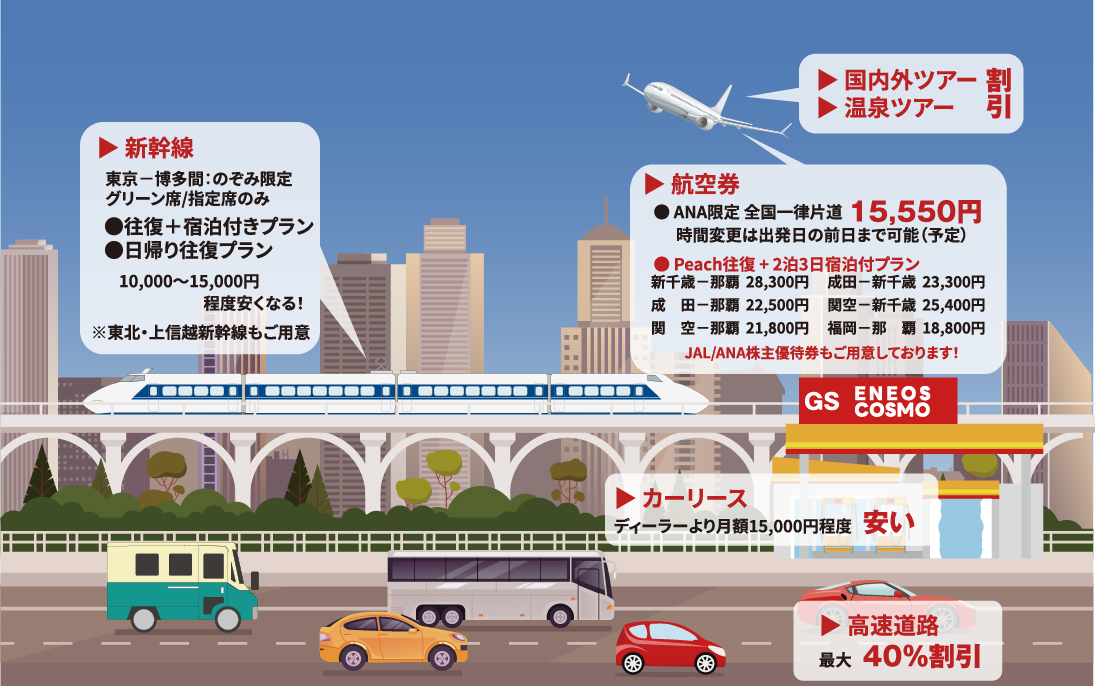 年に1回、出張するだけで、年会費の元が取れてしまいます。毎月出張する方だと、120,000円~お得に、社員100人だと、12,000,000円のコスト削減につながります。